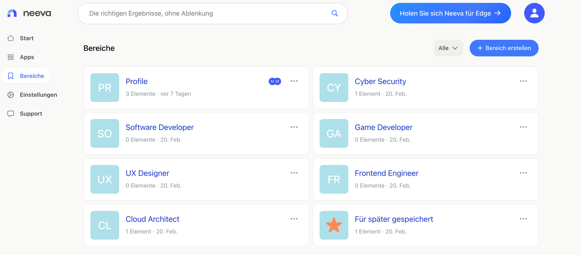 Ab dem 08. Mai 2023 hat Neeva die Funktionen "Bereiche" bzw. Spaces, Personalisierte Suche und Connected Apps deaktiviert. Damit ist leider das Speichern Deiner Suchergebnisse in Bereiche nicht mehr möglich.