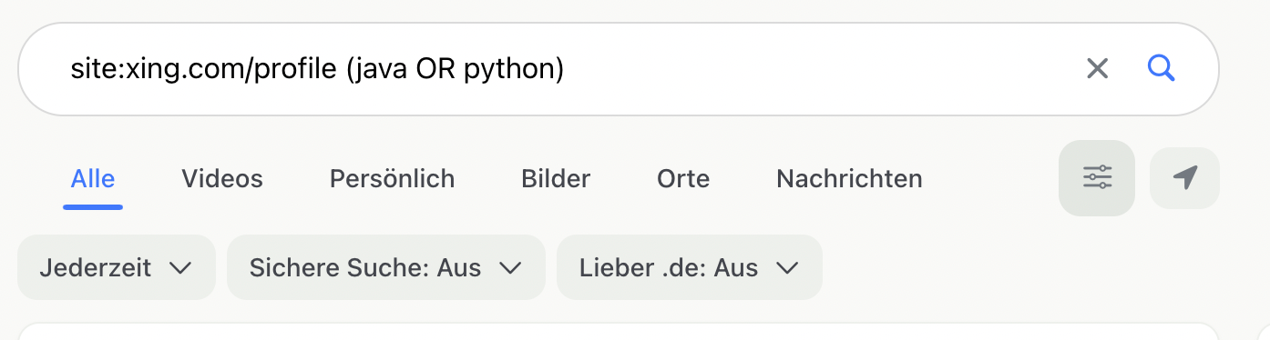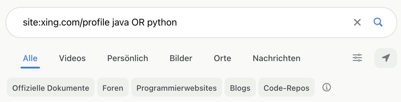 In den nachfolgenden Beispielen habe ich als Suchparameter die beiden beruflichen Plattformen Xing und Linkedin verwendet. Als Ergänzung soll nach Java oder Python gesucht werden.